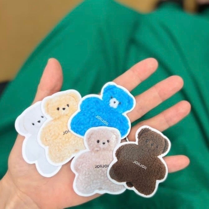 鮮やかなブルーや、クルクルの毛並みがかわいいイエロー、手のひらサイズの小さなベアは色ごとにポーズやふっくら具合を変えたこだわりのチャームです。